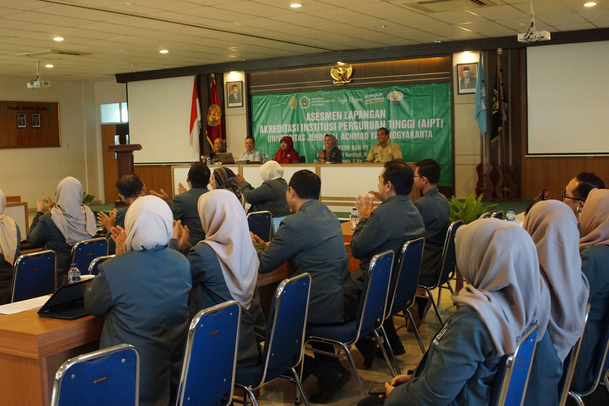 SLEMAN – Bertempat di Ruang Auditorium Lt. 4 Kampus 1, diselenggarakan Assesmen Lapangan dalam rangka Akreditasi Institusi Perguruan Tinggi (AIPT) Universitas Jenderal Achmad Yani Yogyakarta (Unjaya) oleh Tim Badan Akreditasi Nasional Perguruan Tinggi (BAN-PT) pada Jumat-Ahad, (11-13/08/23). Tim BAN-PT terdiri dari Prof. Dr. Ir. Sri Nurdiati, M.Sc., Dr. Untung Sujianto, S.Kp., M.Kes., dan Dr. Abdul Aziz Nasihuddin, S.H., M.M., M.H., disambut langsung Rektor Unjaya, Prof. Dr. rer.nat.apt., Triana Hertiani S.Si.,MSi., didampingi Ketua BPH Unjaya, Brigjen TNI (Purn) Rimbo Karyono, S.I.P., M.M., para Warek Unjaya, para Dekan Unjaya, dan para pejabat struktural Unjaya.