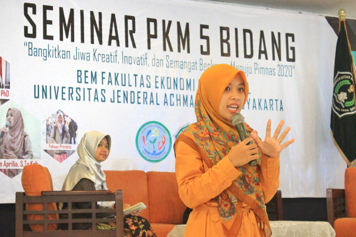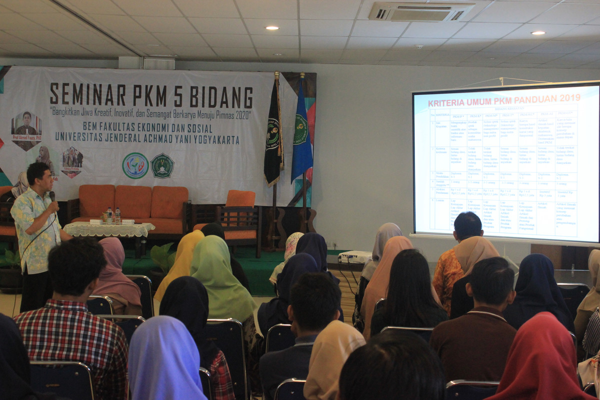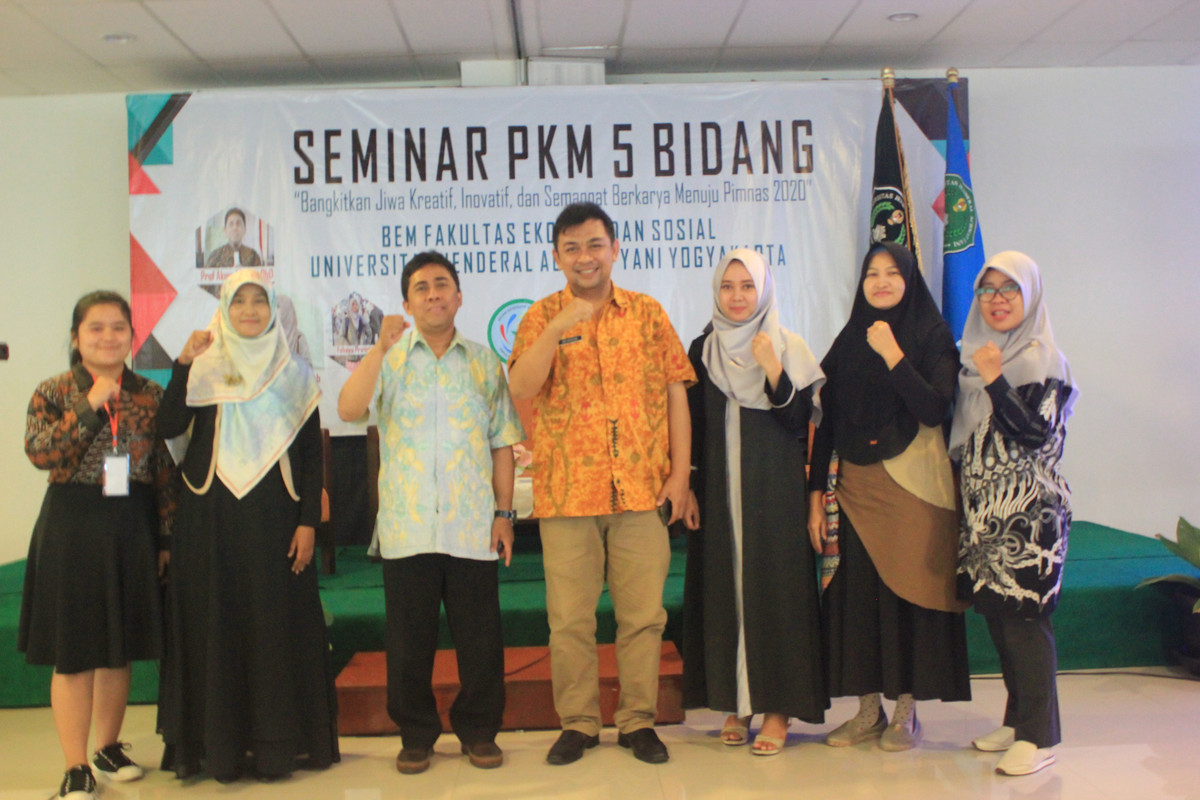 SLEMAN – Dalam rangka merealisasikan program kerjanya untuk mendukung dan bersinergi dengan Fakultas, Badan Eksekutif Mahasiswa Fakultas Ekonomi dan Sosial Universitas Jenderal Achmad Yani Yogyakarta (BEM FES Unjani Yogyakarta) menyelenggarakan seminar sehari dengan topik Program Kreatifitas Mahasiswa (PKM) 5 Bidang mengambil tema “Bangkitkan Jiwa Kreatif, Inovatif, dan Semangat Berkarya menuju Pimnas 2020”. Kegiatan tersebut berlangsung di Auditorium Lt. 4 Kampus 1 Unjani Yogyakarta pada Sabtu, (04/05/2019) yang dibuka oleh Wakil Dekan I FES Unjani Yogyakarta, Adi Heryadi, S.Psi., M.Psi.,Psikolog, dengan menghadirkan Prof. Akhmad Fauzi, Ph.D., yang merupakan Anggota Dewan Eksekutif BAN PT yang juga merupakan reviewer nasional Kemenristekdikti untuk P2M dan PKM.