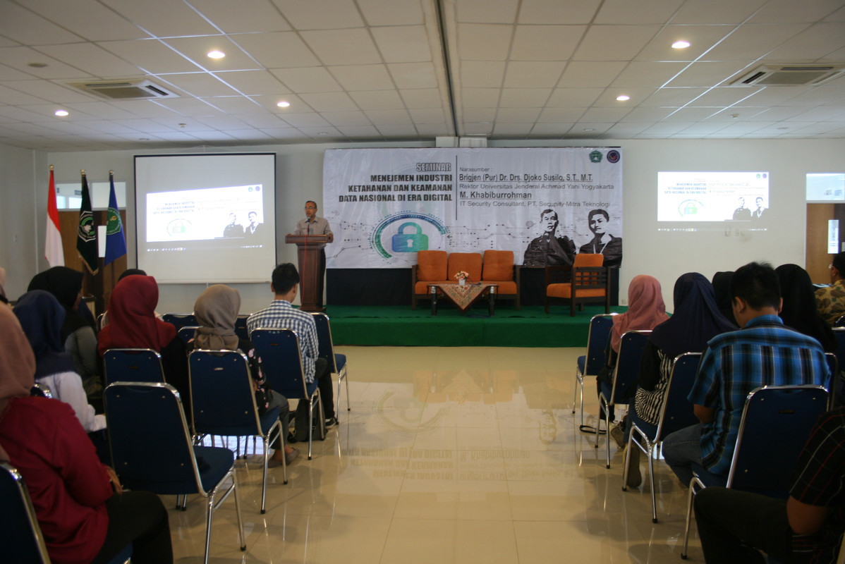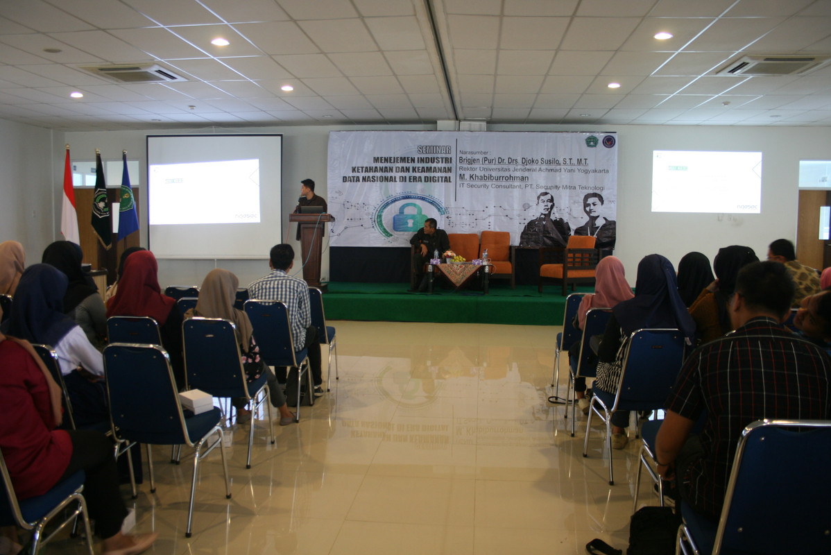 SLEMAN – Keamanan data di era Internet adalah sebuah keniscayaan yang tidak terhindarkan dan oleh karenanya pertahanan dan keamanan atas data menjadi penting. Atas dasar itulah Badan Eksekutif Mahasiswa (BEM) Fakultas Teknik dan Teknologi Informasi Universitas Jenderal Achmad Yani (FTTI Unjani Yogyakarta) menyelenggarakan Seminar Manajemen Industri Ketahanan dan Keamanan yang bertempat di Auditorium Kampus 1 Universitas Jenderal Achmad Yani Yogyakarta pada Sabtu, (26/10/2019). Seminar ini menghadirkan dua orang narasumber, yaitu Dr. Drs. Djoko Susilo, S.T., M.T. selaku Rektor Unjani Yogyakarta dan M. Khabiburohman sebagai praktisi dan konsultan Teknologi Informasi, yang dibuka oleh Dekan FTTI Unjani Yogyakarta, Arif Himawan, S.Kom., M.M., M.Eng. Dalam sambutannya, Dekan FTTI Unjani Yogyakarta menyampaikan bahwa tujuan Seminar ini adalah untuk membangun kesadaran akan pentingnya keamanan data utamanya di era ubiquitous internet dan ekonomi digital seperti saat ini, membuka wawasan tentang peluang menjadi pekerja teknologi informasi di bidang keamanan siber (cyber security) dan peluang menjadi wirausahawan teknologi (technopreneur) di bidang keamanan data, sehingga mahasiswa dapat mengetahui bagaimana perkembangan cyber security di era digital sehingga dapat semakin menggarisbawahi keamanan data pada studinya.