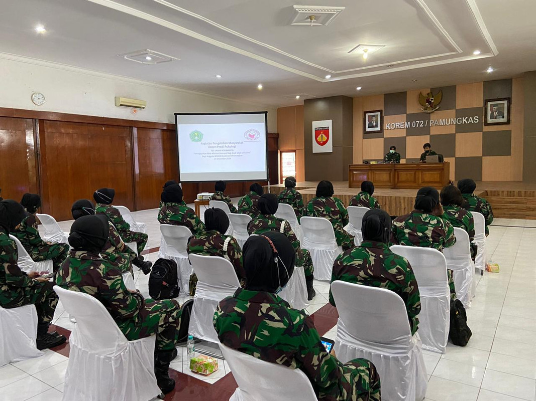 YOGYAKARTA – Bertepatan dengan HUT Korps Wanita Angkatan Darat (Kowad) ke 59 dan peringatan Hari Anti Korupsi Sedunia, Prodi Psikologi Fakultas Ekonomi dan Sosial Universitas Jenderal Achmad Yani Yogyakarta (FES UNJAYA) bersinergi dengan Kowad Korem 072/PMK menyelenggarakan dialog dan diskusi dengan tema “mengajarkan nilai-nilai anti korupsi pada anak sejak usia dini” dalam rangkaian Pengabdian Kepada Masyarakat (PKM) bertempat di ruang serbaguna Korem 072/PMK pada Rabu, (23/12/2020). Acara di mulai dengan sambutan dari perwakilan Kowad Korem 072/PMK yang disampaikan oleh Letkol Ckm dr. Virni Sagita Ismayawati, MARS yang sehai-hari menjabat sebagai Dandenkesyah 04.04.02. Dalam sambutannya, Letkol Ckm dr. Virni Sagita menyampaikan ucapan terima kasih atas sinergi dan terselenggaranya kegiatan yang sangat bermanfaat bagi anggota Kowad yang notabene adalah ibu dari anak-anak dan istri dalam rumah tangga.