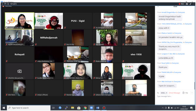 Para Narasumber secara bergantian menyampaikan materinya yang dimulai oleh Narasumber pertama, Annisa Marezqa (IFRC) dengan tema “Insidensi kasus dan tindakan bullying dan harrasment di lapangan” dilanjutkan Narasumber kedua, Assistant Professor Dr. Juraporn Tangpukdee (Khon Kaen University, Thailand) dengan tema “Konsep bullying dan harassment serta strategi pemecahan masalahnya di Thailand” dilanjutkan oleh Narasumber ketiga, Hesty Yuliasari, S.Psi., M.Psi., Psikolog. (Dosen Prodi Psikologi UNJAYA) dengan tema “konsep bullying dan harassment serta strategi pemecahan masalahnya di Indonesia”, dan terakhir Narasumber keempat, Fransisca Romana Sri Supadmi., A.Md.Kes., SKM., M.Sc. (Dosen dan Kaprodi Teknologi Bank Darah UNJAYA) dengan tema “Palang Merah Remaja dan menjadi Pendonor Darah Yang Sukses sebagai Upaya Mengatasi Bullying dan Harrashment di Sekolah”. Kegiatan Webinar Internasional ini di ikuti oleh 766 peserta yang bukan hanya dari Indonesia, namun juga dari beberapa Negara sahabat seperti Malaysia, Thailand, dan Timor Leste. [kpp]