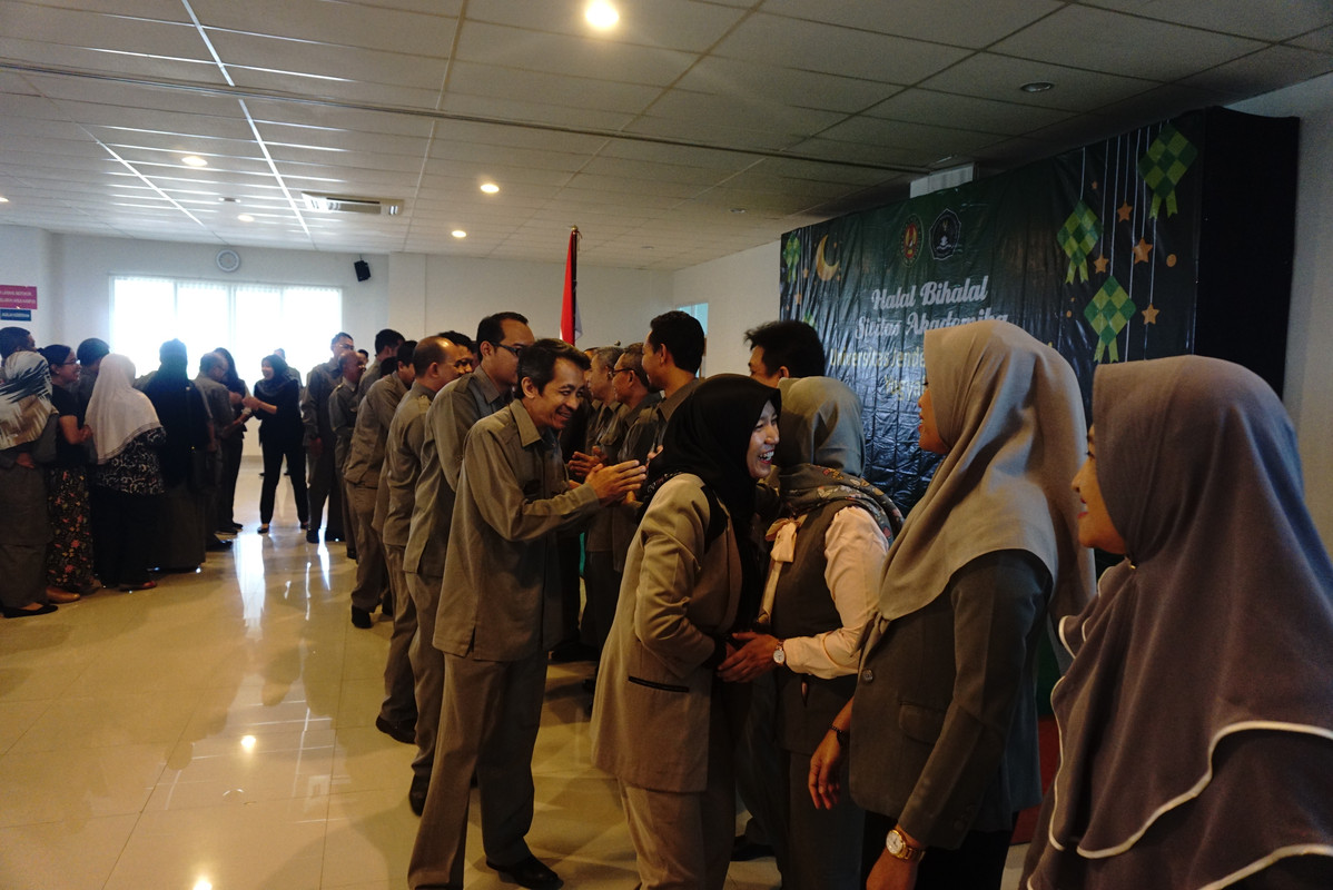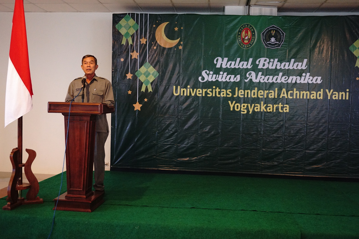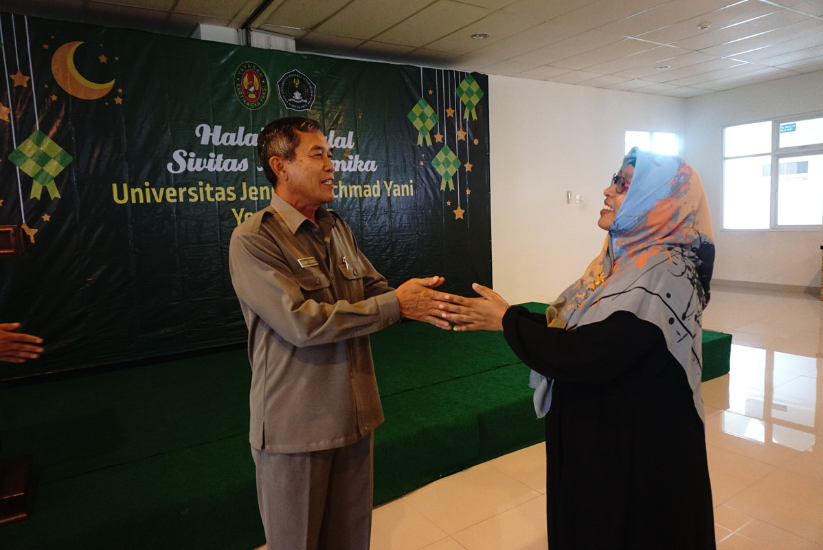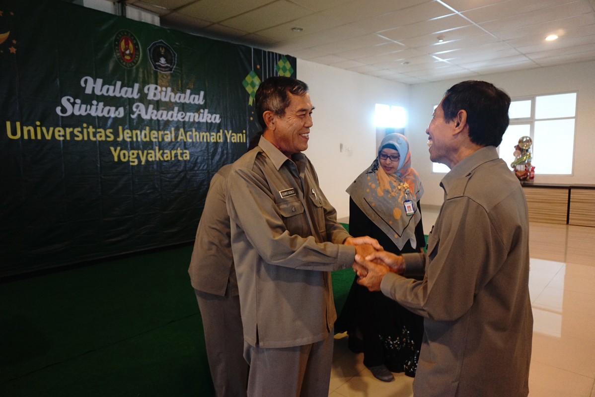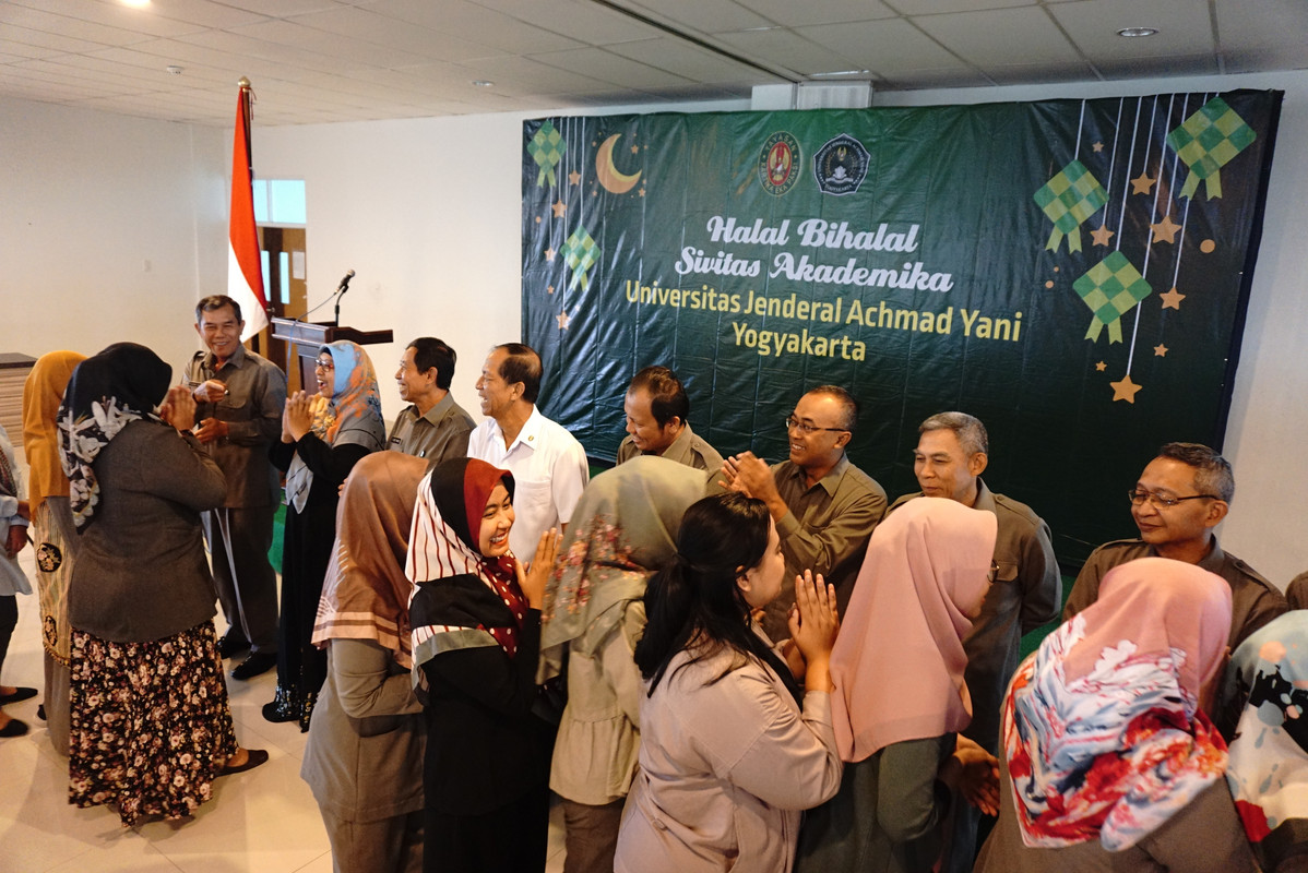 SLEMAN – Mengawali hari pertama kerja setelah libur Idul Fitri 1440 H, keluarga besar Universitas Jenderal Achmad Yani (Unjani) Yogyakarta menyelenggarakan Syawalan sebagai sebuah tradisi yang dilakukan setiap tahun, dengan ditandai saling bersalam-salaman dan ungkapan saling memaafkan yang diselenggarakan di Auditorium Lt. 4 Kampus 1 Unjani Yogyakarta, pada Senin (17/06/2019). Kegiatan Syawalan ini diawali dengan sambutan dari Rektor Unjani Yogyakarta, Dr. Drs. Djoko Susilo, S.T., M.T., yang dihadiri oleh dosen dan tenaga kependidikan Unjani Yogyakarta.