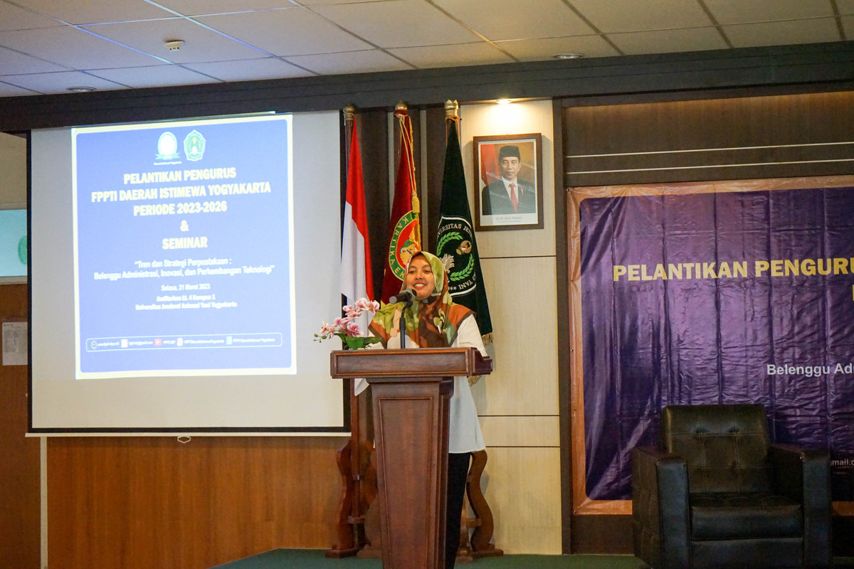 Sedangkan dalam sambutannya, Ketua FPPTI DIY terpilih, Risty Prasetyawati, SIP., M.A yang juga merupakan Kepala Perpustakaan Unjaya menyampaikan ucapan terima kasih kepada pengurus FPPTI periode 2019-2022, perpustakaan anggota, DPAD DIY, organisasi kepustakawanan (IPI, ATPUSI, dan FPPTMA), dan berharap semua komponen tersebut bisa saling bekerjasama dan saling mendukung untuk kemajuan FPPTI DIY dan kepustakawanan pada umumnya.