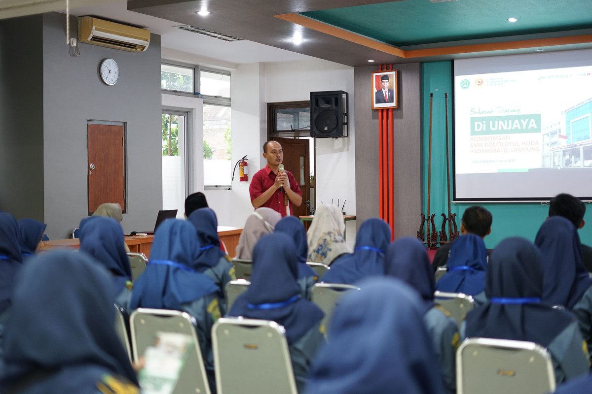 SLEMAN – Bertempat di Gedung Serba Guna Kampus 2, Universitas Jenderal Achmad Yani Yogyakarta (Unjaya) kembali menerima kunjungan dari SMK Roudlotul Huda Padangratu Lampung Tengah, Lampung pada Rabu, (5/7/2023). Rombongan SMK Roudlotul Huda yang terdiri dari 70 Siswa dan 6 guru pendamping dipimpin oleh Kepala Sekolah, Bapak Tugino diterima langsung oleh Kabiro Kerja Sama, Promosi, dan Admisi (KPA) Unjaya, Bambang Tri Sutrisno, S.Kom., M.Kom.