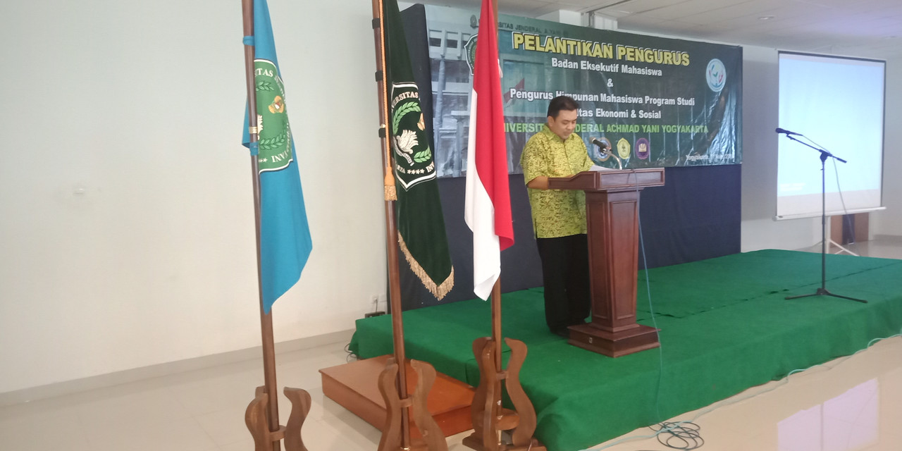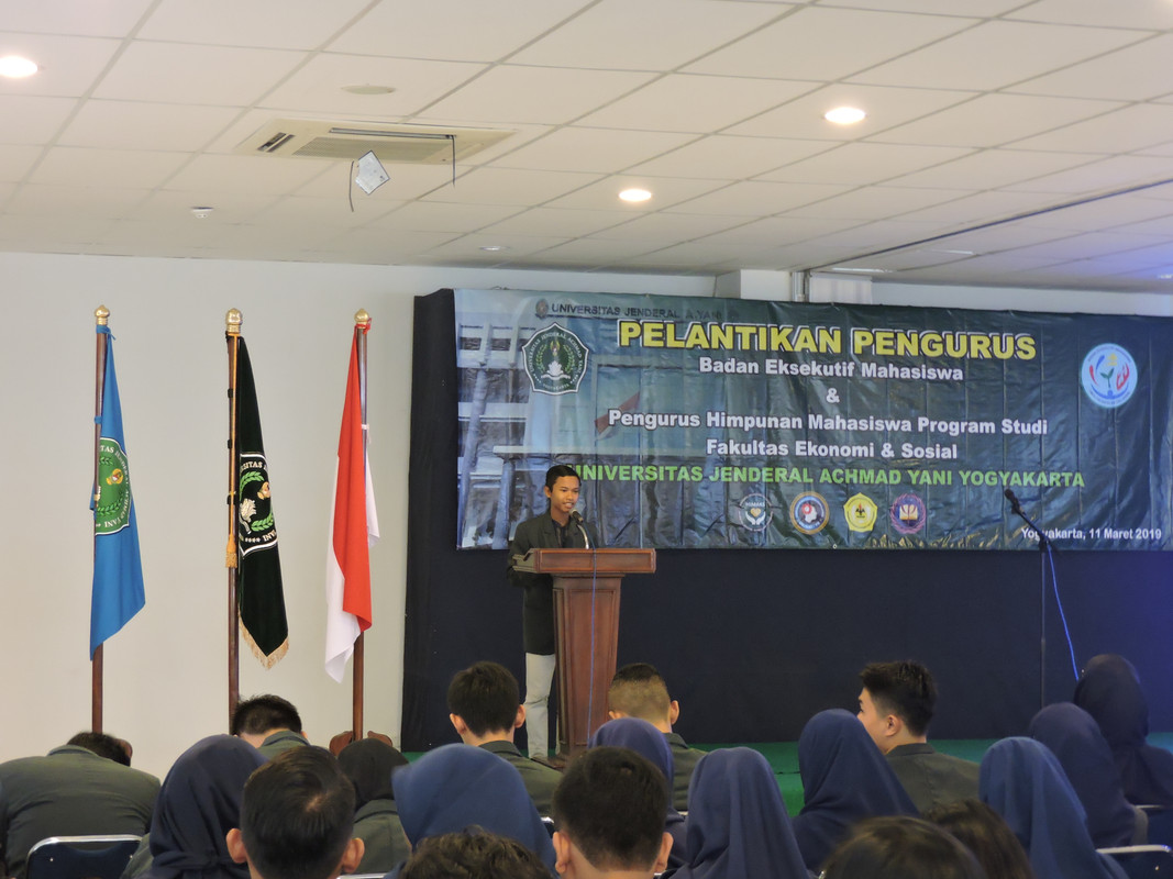 SLEMAN – Bertempat di Auditorium Kampus 1 Universitas Jenderal Achmad Yani (Unjani) Yogyakarta, pada Senin (11/03/2019) Dekan Fakultas Ekonomi dan Sosial (FES) Unjani Yogytakarta, Edhy Tri Cahyono,S.Si.,M.M. mengukuhkan berdirinya Organisasi Kemahasiswaan (Ormawa) di lingkungan FES Unjani Yogyakarta dan melantik pengurus periode 2019/2020. Adapun Ormawa yang dikukuhkan adalah Badan Eksekutif Mahasiswa (BEM) FES Unjani Yogyakarta, Himpunan Mahasiswa Prodi Manajemen (HIMMA), Himpunan Mahasiswa Prodi Akuntansi (HIMAKS), Himpunan Mahasiswa Prodi Hukum (HIMAKUM), dan Himpunan Mahasiswa Prodi Psikologi (HIMAPSI) yang ditandai dengan pembacaan surat keputusan oleh Wakil Dekan I FES Unjani Yogyakarta, Adi Heryadi,S.Psi.,M.Psi., Psikolog., dan dilanjutkan dengan pengambilan sumpah jabatan pengurus BEM dan HIMA. Dalam Sambutannya, Dekan Unjani Yogyakarta menyampaikan selamat dan sukses kepada para pengurus BEM dan HIMA serta berpesan agar dapat menjalankan amanah sesuai janji yang telah diucapkan, serta dapat berharap Ormawa di lingkungan FES Unjani Yogyakarta dapat bersinergi untuk menuju visi FES Unjani Yogyakarta. “Melalui Ormawa, Dekan berharap agar muncul proposal-proposal kreatif mahasiswa yang bisa diikutkan lomba PKM di tingkat Nasional”, katanya. Lebih Lanjut Dekan FES Unjani Yogyakarta juga berpesan agar BEM mampu menjadi media pembelajaran dan peningkatan softskill mahasiswa agar lulus nanti menjadi sarjana yang betul-betul menjiwai nilai-nilai Adithya Mahatma Daksa seperti cita-cita Unjani Yogyakarta.