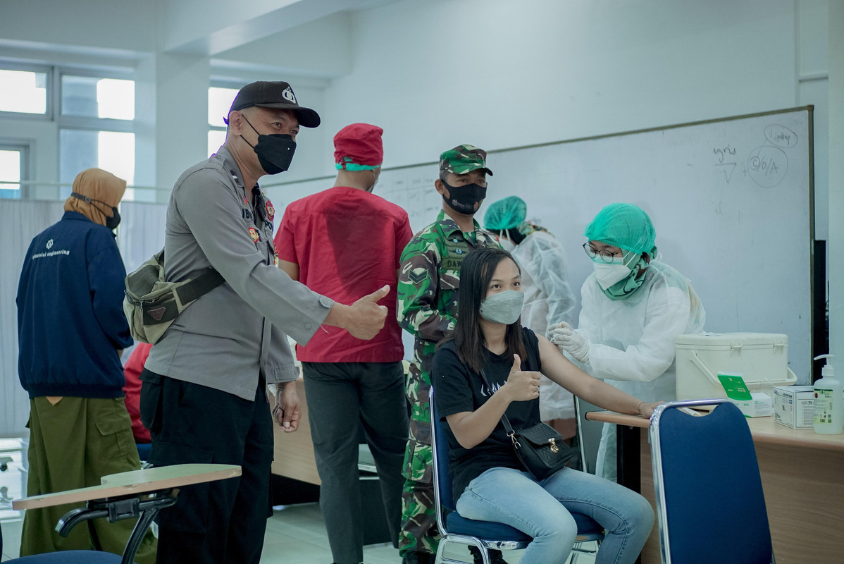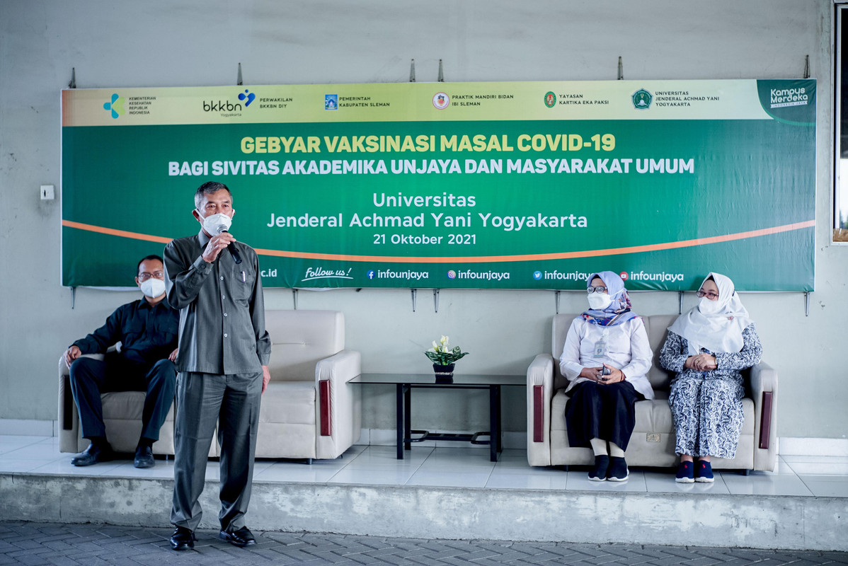 SLEMAN – Bertempat di Kampus 2 Universitas Jenderal Achmad Yani Yogyakatrta (Unjaya), dilaksanakan kegiatan gebyar vaksinasi massal yang diikuti oleh sivitas akademika dan masyarakat umum yang di buka langsung oleh Rektor Unjaya, Dr. Drs. Djoko Susilo, S.T., M.T., IPU., pada Kamis, (21/10). Kegiatan vaksinasi massal ini merupakan hasil kerja sama antara Unjaya dengan Perwakilan Badan Kependudukan dan Keluarga Berencana Nasional Daerah Istimewa Yogyakarta (BKKBN DIY), Ikatan Bidan Indonesia (IBI) Sleman, dan Dinas Pemberdayaan Perempuan dan Perlindungan Anak, Pengendalian Penduduk dan Keluarga Berencana (DP3AP2KB) Kab. Sleman untuk mendukung percepatan program vaksinasi di lingkungan Kampus. Selain itu kegiatan gebyar vaksinasi ini merupakan bagian upaya memberikan kekebalan kelompok (herd immunity) di lingkungan Kampus, sehingga Kampus dapat menyelenggarakan Pembelajaran Tatap Muka (PTM).