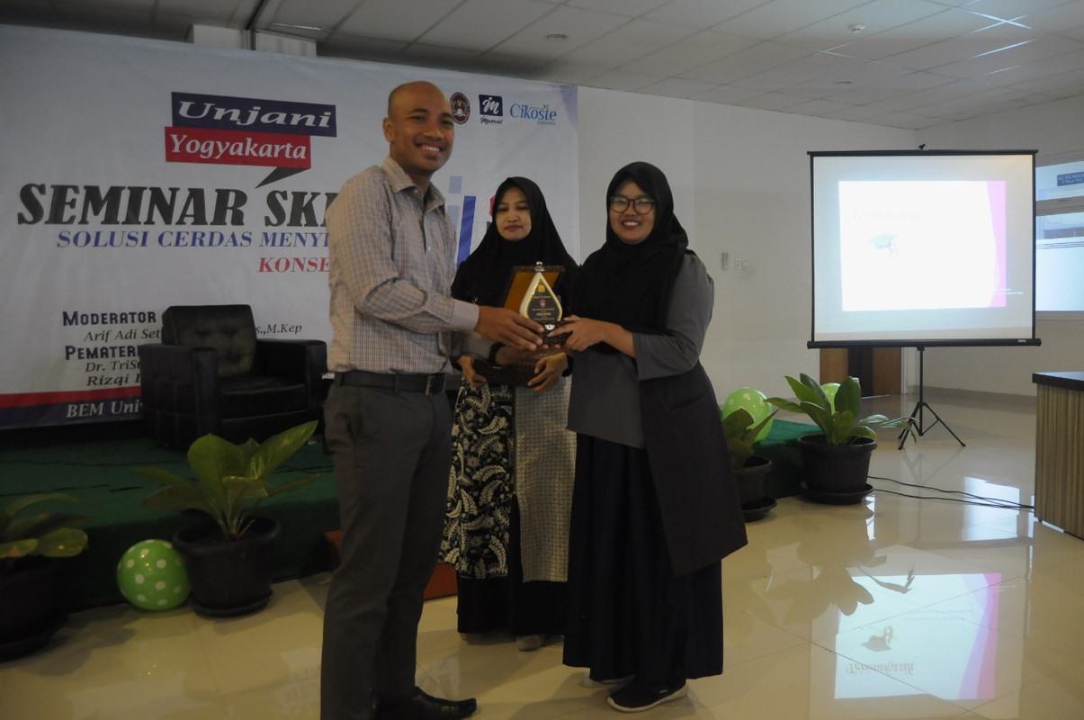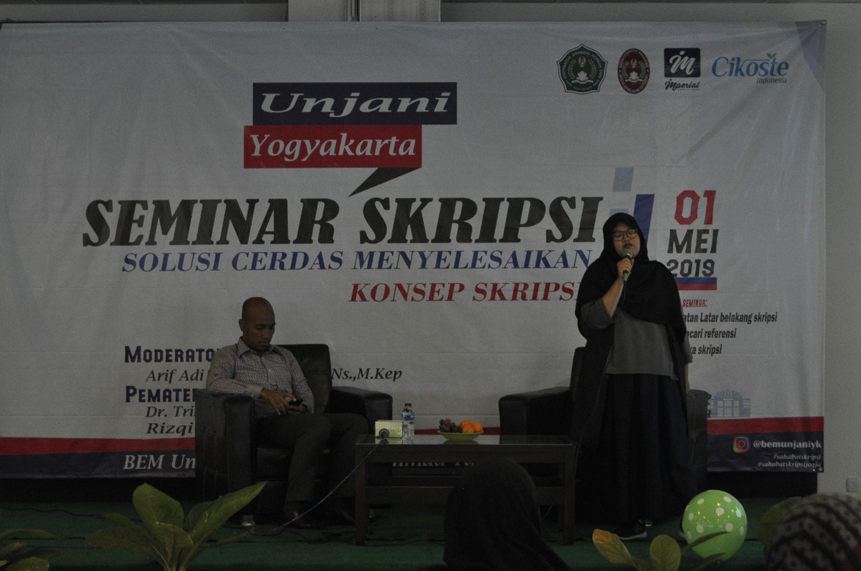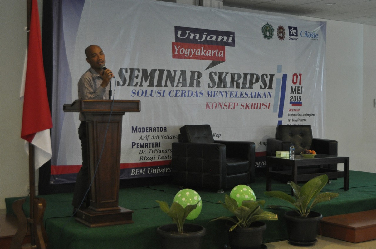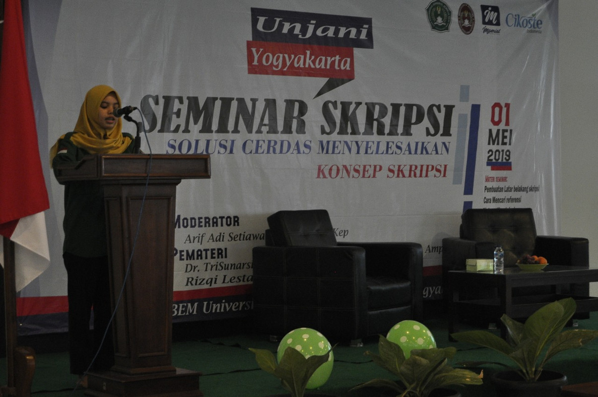 Skripsi adalah istilah yang digunakan di Indonesia untuk mengilustrasikan suatu karya tulis ilmiah berupa paparan tulisan hasil penelitian sarjana S1 yang membahas suatu permasalahan atau fenomena dalam bidang ilmu tertentu dengan menggunakan kaidah-kaidah yang berlaku. Seminar skripsi ini digelar oleh Badan Eksekutif Mahasiswa Universitas Jenderal Achmad Yani dengan tema Solusi Cerdas Menyelesaikan Konsep Skripsi di Gedung Auditorium, pada Minggu (28/4/2019). Kegiatan ini menghadirkan dua orang pembicara, yaitu Ibu Rizqi Lestari dan Ibu Dr. Tri Sunarsi S.ST., M.Kes. Selain itu, kegiatan seminar skripsi BEM Unjani yang di ikuti oleh 50 peserta dari mahasiswa Universitas Jenderal Achmad Yani, skripsi ini bertujuan agar mahasiswa mampu menyusun dan menulis karya ilmiah, sesuai dengan bidang ilmunya. Mahasiswa yang mampu menulis skripsi dianggap mampu memadukan pengetahuan dan keterampilannya dalam memahami, menganalisis, menggambarkan, dan menjelaskan masalah yang berhubungan dengan bidang keilmuan yang diambilnya. Skripsi merupakan persyaratan untuk mendapatkan status sarjana (S1) di setiap Perguruan Tinggi Negeri (PTN) maupun Perguruan Tinggi Swasta (PTS) yang ada di Indonesia.