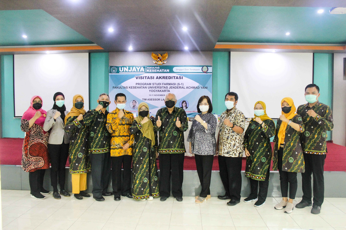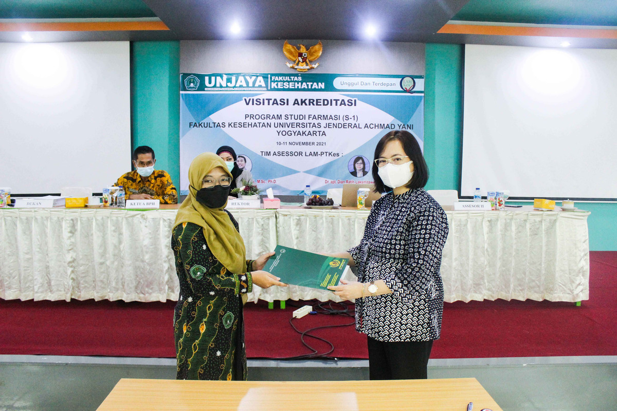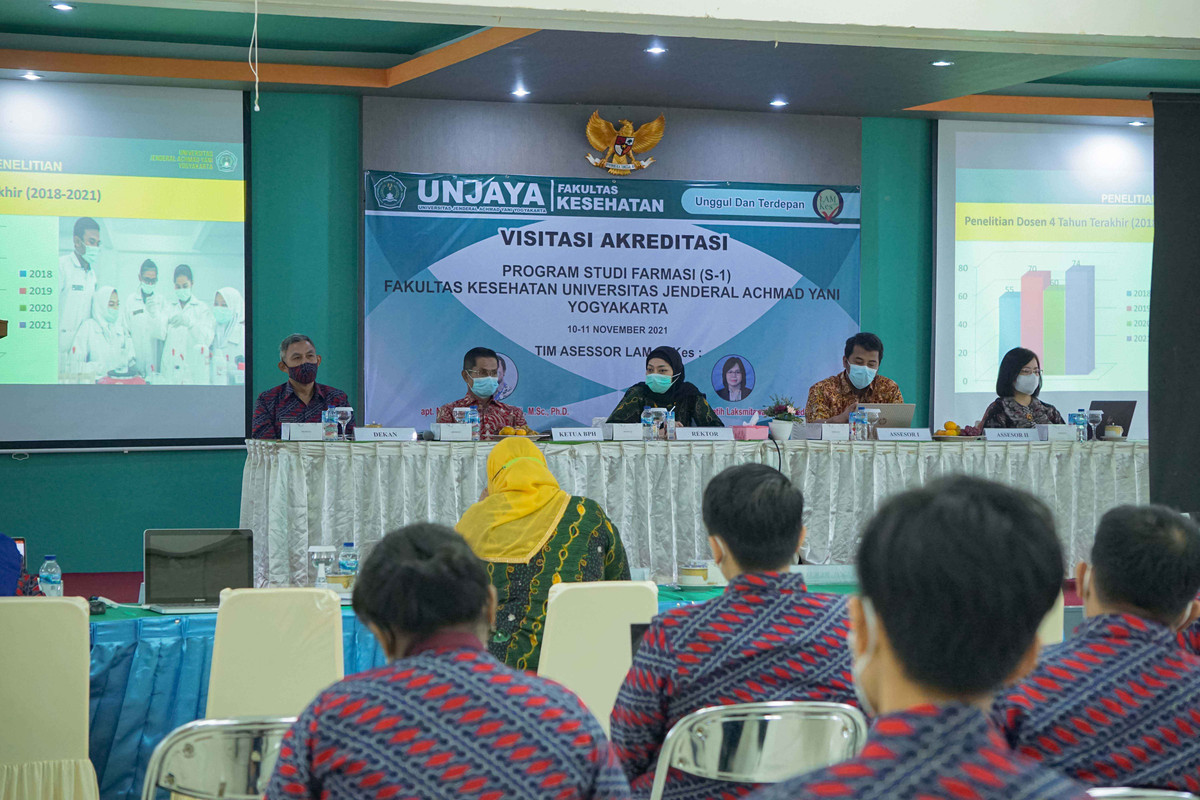 SLEMAN – Sebagai tindak lanjut Assesmen Lapangan Daring (ALD) Akreditasi Prodi Farmasi (S-1) Fakultas Kesehatan Universitas Jenderal Achmad Yani Yogyakarta (Fkes Unjaya) yang telah dilakukan pada 10 November 2020 yang lalu, pada Rabu-Kamis, (10-11/11/21) diselenggarakan Visitasi oleh Tim Lembaga Akreditasi Mandiri Pendidikan Tinggi Kesehatan Indonesia (LAM-PTKes). Tim LAM-PTKes terdiri dari Bapak Mahardian Rahmadi, M.Sc. Ph.D., Apt., dan Ibu Dr. Dian Ratih Laksmitawati, M.Biomed., Apt. yang disambut langsung oleh Wakil Rektor 1 Unjaya, Wenny Savitri, S.Kep., Ns., MNS., dan Warek 2 Unjaya, Ida Nursanti, S.Kep., Ns., M.P.H., beserta para pejabat struktural Rektorat dan Fakultas Kesehatan di Gedung Serba Guna Kampus 2, Jl. Brawijaya Ringroad Barat, Gamping, Sleman, Yogyakarta.