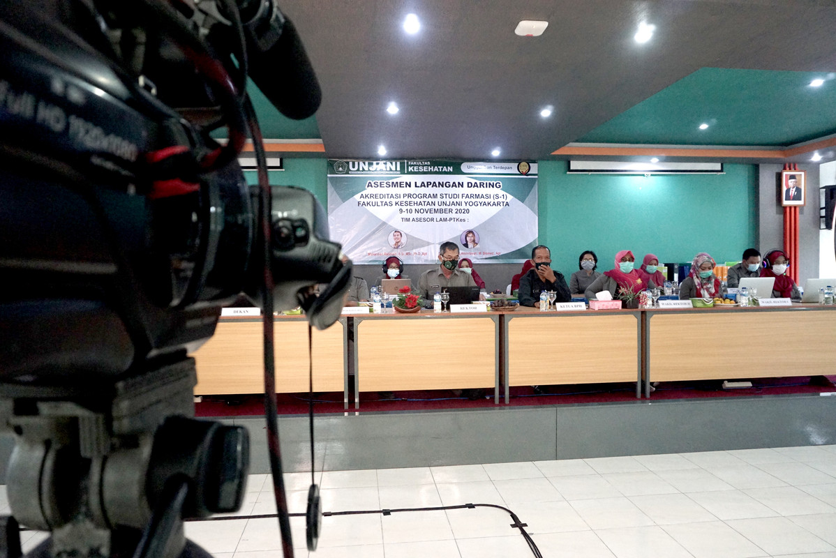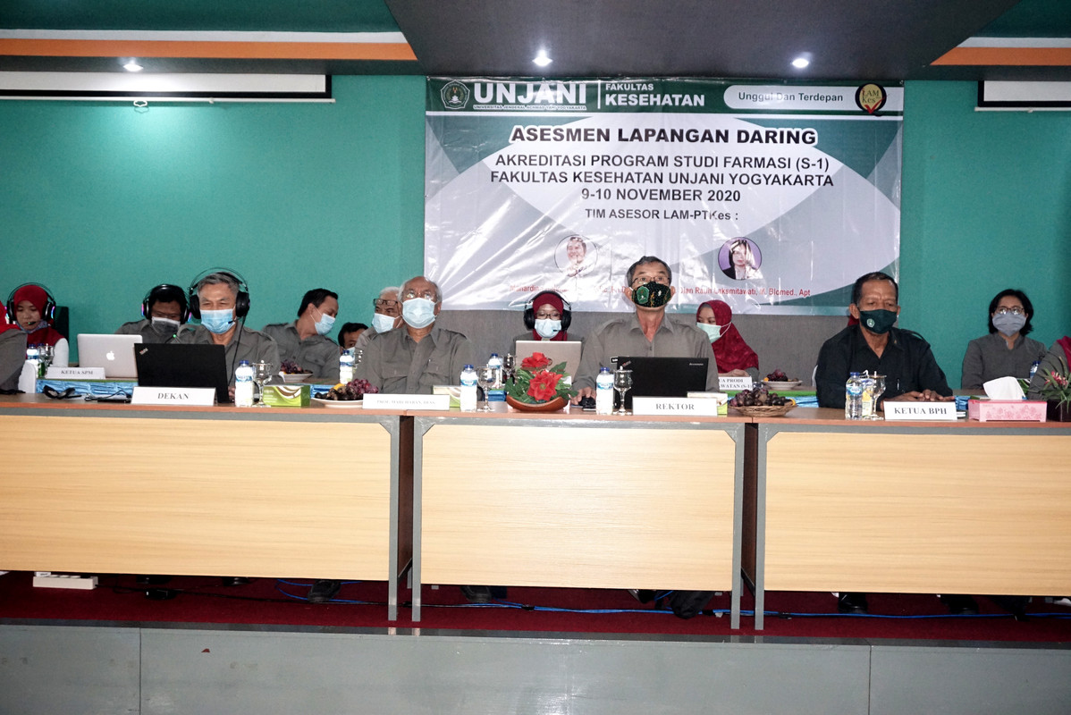 SLEMAN – Tim Assesmen Lapangan Daring (ALD) Lembaga Akreditasi Mandiri Pendidikan Tinggi Kesehatan Indonesia (LAM-PTKes) mengunjungi Universitas Jenderal Achmad Yani Yogyakarta (UNJAYA) pada Senin-Selasa, (09-10/11/2020). Kunjungan tersebut dalam rangka Assesmen atas pengajuan Akreditasi Prodi Farmasi (S-1) yang sudah di ajukan sejak bulan Maret 2020 dan sempat tertunda akibat pandemi Covid-19. Tim LAM-PTKes terdiri dari Bapak Mahardian Rahmadi, S.Si.,M.Sc., Ph.D., Apt., dan Ibu Dr. Dian Ratih Laksmitawati, M.Biomed, Apt., yang disambut langsung oleh Rektor UNJAYA, Dr. Drs. Djoko Susilo, ST., MT., IPU., beserta para pejabat struktural Rektorat dan Fakultas Kesehatan di Gedung Serba Guna Kampus 2, Jl. Brawijaya Ringroad Barat, Gamping, Sleman, Yogyakarta.