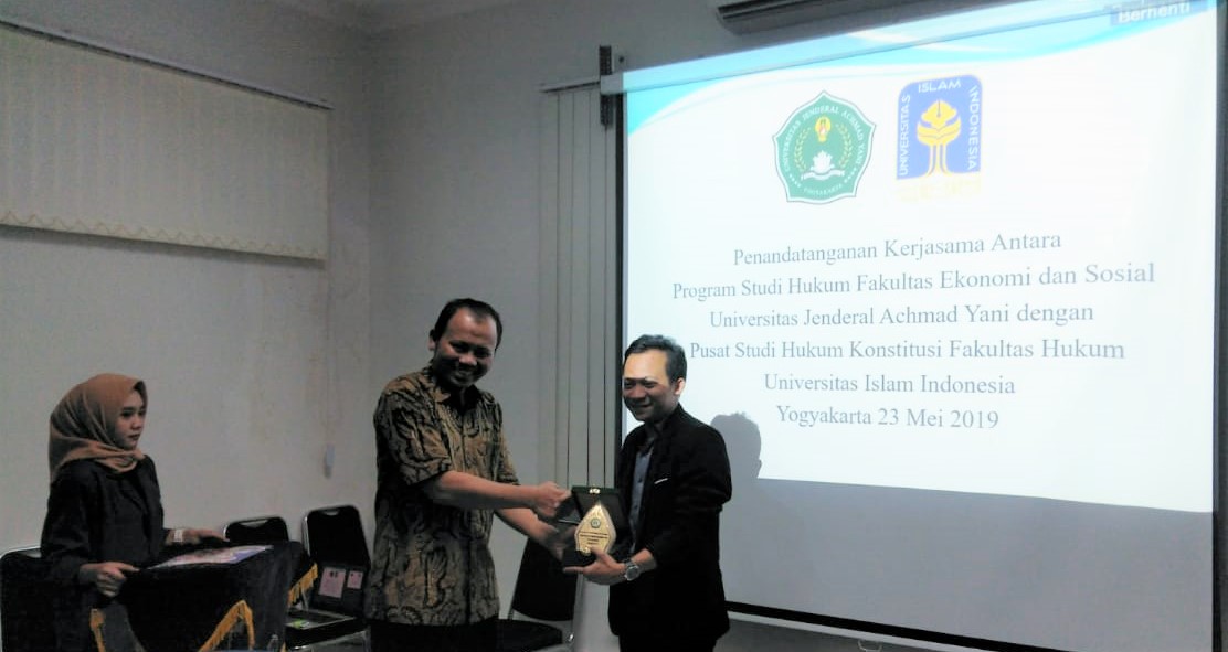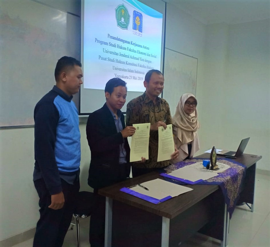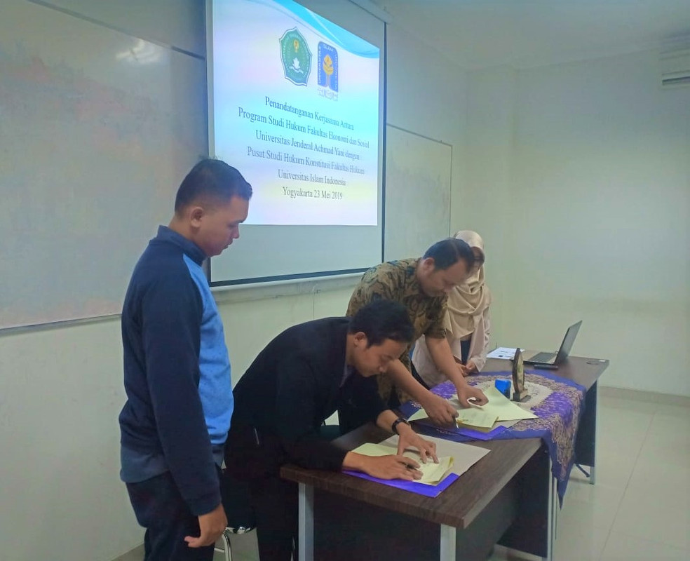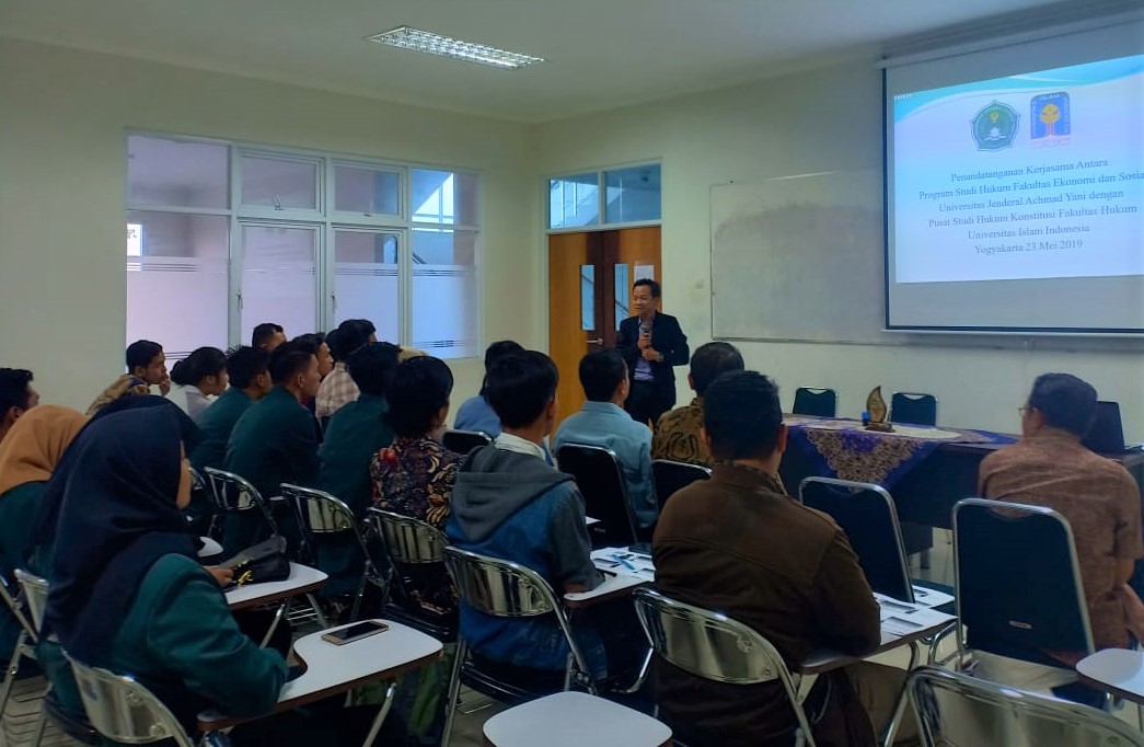 SLEMAN – Bertempat di Ruang 3A Kampus 1 Universitas Jenderal Achmad Yani Yogyakarta (Unjani) Yogyakarta, diselenggarakan penandatanganan perjanjian kerja sama antara Program Studi Hukum Fakultas Ekonomi dan Sosial Universitas Jenderal Achmad Yani Yogyakarta (Prodi Hukum FES Unjani Yogyakarta) dengan Pusat Studi Hukum Konstitusi Fakultas Hukum Universitas Islam Indonesia (PSHK FH UII) pada Kamis (23/05/2019). Penandatanganan dilakukan oleh Dekan FES Unjani Yogyakarta, Edhy Tri Cahyono, S.Si., M.M. dan Direktur PSHK FH UII, Allan Fatchan Gani Wardhana, S.H., M.H., yang disaksikan oleh Keprodi Hukum FES Unjani Yogyakarta, Niken Wahyuning Retno Mumpuni, S.H., M.H., para Dosen Prodi Hukum FES Unjani Yogyakarta, Penasehat PSHK FH UII, Dr. Saifudin, S.H., M.Hum, jajaran Pengurus dan peneliti PSHK FH UII, serta para mahasiswa Prodi Hukum FES Unjani Yogyakarta.