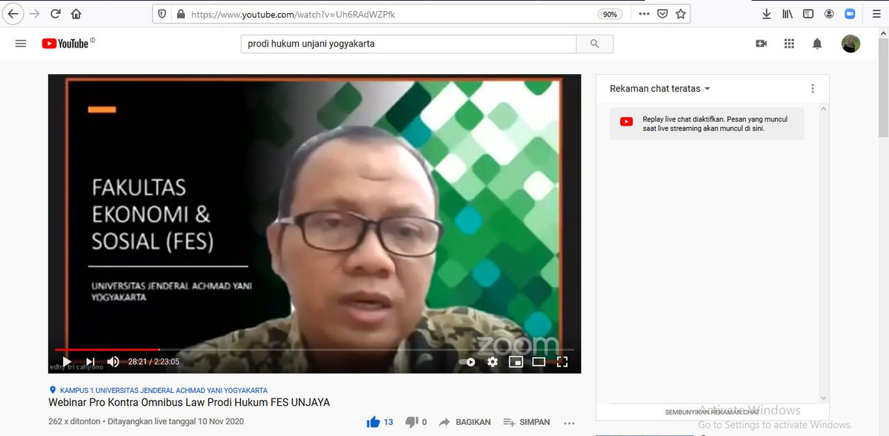 SLEMAN – Bertepatan dengan Hari Pahlawan, Program Studi Hukum Fakultas Ekonomi dan Sosial Universitas Jenderal Achmad Yani Yogyakarta (FES UNJAYA) menyelenggarakan Webinar dengan tema “Pro Kontra Omnibus Law & Struktur Perundangan di Indonesia (Kewenangan, Prosedur Membentuk, dan Mengubah Peraturan Perundang-Undangan)” pada Selasa, (10/11/2020). Omnibus law merupakan sebuah cara penyederhanaan pembuatan regulasi atau aturan yang mana suatu Undang-Undang baru dapat memuat beragam substansi aturan yang keberadaannya mengamandemen beberapa Undang-Undang sekaligus. Di tahun 2020 ini, DPR telah mengesahkan omnibus law yakni Undang-Undang Cipta Kerja yang menuai protes dari banyak kalangan dan memicu aksi demonstrasi serta kericuhan di beberapa daerah. Meski demikian, pada tanggal 2 November 2020, Presiden Joko Widodo tetap mengesahkan Rancangan Undang-Undang Cipta Kerja menjadi Undang-Undang Nomor 11 Tahun 2020 tentang Cipta Kerja (UU Cipta Kerja), sehingga Undang-Undang tersebut telah sah diberlakukan dan mengikat secara hukum. Lalu, bagaimanakah sebenarnya struktur pengaturan perundang-undangan yang baik dan bagaimanakah dampak positif dan negatif dari disahkannya Undang-Undang Cipta Kerja tersebut merupakan pertanyaan-pertanyaan yang memicu Prodi Hukum FES UNJAYA untuk menyelenggarakan webinar ini.