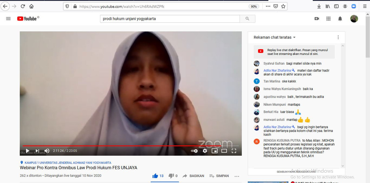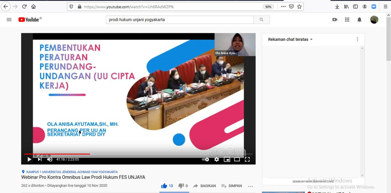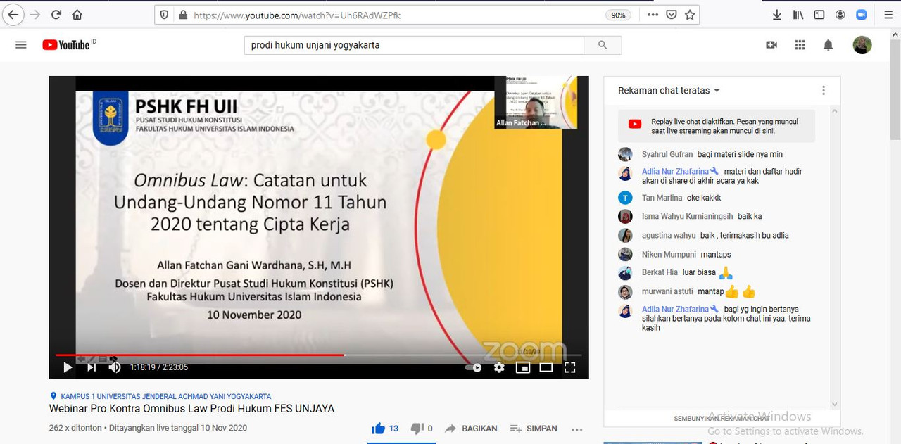 Acara webinar ini dihadiri oleh peserta dari kalangan umum baik pekerja, akademisi, praktisi, siswa maupun mahasiswa yang ada di wilayah Yogyakarta maupun di luar Yogyakarta. Acara dipandu oleh pembawa acara sekaligus moderator yaitu Ibu Niken Wahyuning Retno Mumpuni S.H., M.H. selaku Dosen Prodi Hukum FES UNJAYA. Acara dimulai dengan paparan sambutan dari Dekan FES UNJAYA yaitu Bapak Edhy Tri Cahyono, S.Si., M.M. yang pada intinya beliau menyambut baik dan memberikan apresiasi kepada Prodi Hukum FES UNJAYA yang telah menyelenggarakan acara webinar ini dengan baik. Selanjutnya memasuki acara inti, yakni paparan dari dua narasumber yang ahli di bidang penyusunan peraturan perundang-undangan. Para Narasumber tersebut adalah Ibu Ola Anisa Ayutama, S.H., M.H. selaku Perancang Peraturan Perundang-Undangan Sekretariat Dewan Perwakilan Rakyat Daerah Propinsi Daerah Istimewa Yogyakarta (DPRD DIY) dan Bapak Allan Fatchan Gani Wardhana, S.H., M.H. selaku Direktur Pusat Studi Hukum Konstitusi Fakultas Hukum Universitas Islam Indonesia (PSHK FH UII). Paparan dari pemateri pertama berkaitan dengan kewenangan, prosedur membentuk dan mengubah peraturan perundang-undangan, gambaran umum tentang Omnibus Law dan tata cara legislasi pembentukan Undang-Undang yang harus berdasar pada Undang-Undang Nomor 12 Tahun 2011 tentang Pembentukan Peraturan Perundang-Undangan yang diperbaharui menjadi Undang-Undang Nomor 15 Tahun 2019. Sedangkan paparan dari pemateri kedua berkaitan dengan problematika disahkannya Undang-Undang Omnibus Law dan solusi penyelesaiannya. Ketika sesi diskusi, peserta cukup antusias terbukti dengan banyaknya pertanyaan dan tangapan yang disampaikan baik pada room chatt zoom maupun pada kolom komentar youtube. Penyelenggaraan webinar dapat berjalan dengan lancar hingga tahap akhir.