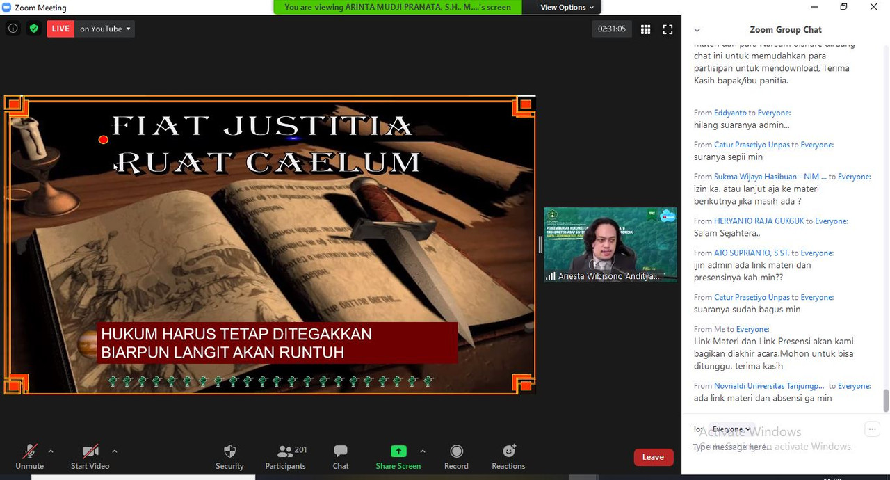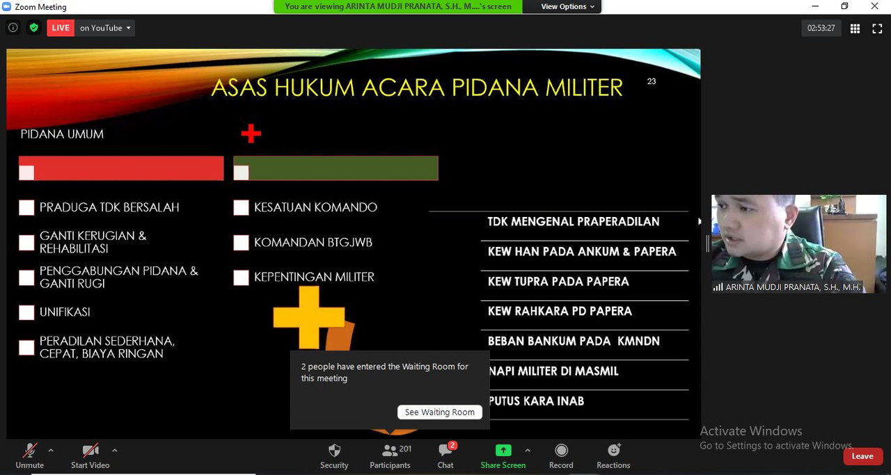 Acara webinar dipandu oleh pembawa acara sekaligus moderator yaitu Bapak Ariesta Wibisono Anditya, S.H., M.Kn.,M.H, selaku dosen Prodi Hukum FES UNJAYA kemudian acara dimulai dengan sambutan oleh Dekan FES UNJAYA Bapak Edhy Tri Cahyono, S.Si., M.M. Dalam sambutannya, Dekan FES memberikan apresiasi kepada Prodi Hukum FES UNJAYA atas penyelenggaraan acara webinar bertema hukum militer yang merupakan kekhasan Prodi Hukum FES UNJAYA. Beliau juga berharap melalui forum ini bisa lebih memperkuat jalinan kerjasama antara Prodi Hukum FES UNJAYA dengan Detasemen Polisi Militer Angkatan Darat IV/2 Yogyakarta, Oditurat Militer II-10 Yogyakarta, dan Pengadilan Militer II-11 Yogyakarta.