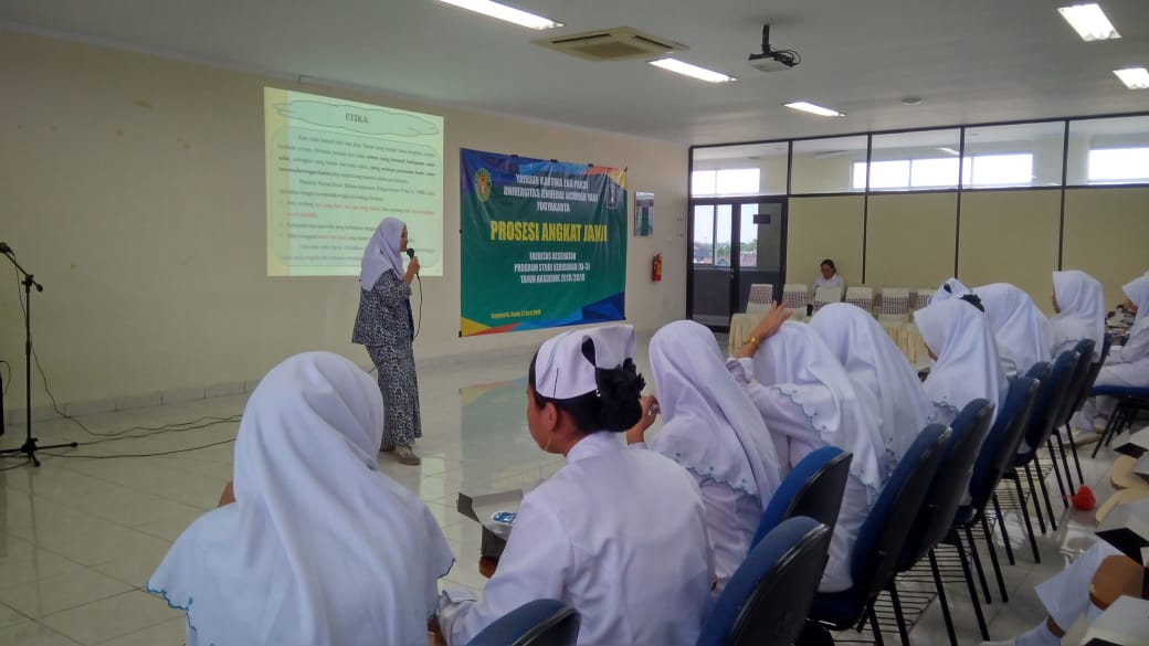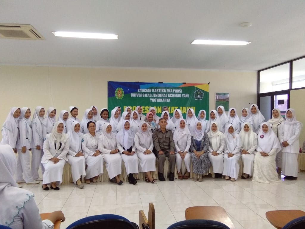 SLEMAN – Bertempat di Ruang Amphitheater Lt. 4 Kampus 2 Universitas Jenderal Achmad Yani Yogyakarta, mahasiswa Prodi Kebidanan (D-3) melaksanakan Prosesi Angkat Janji sebelum menjalani kegiatan praktik, pada Senin, (22/04/2019). Berdasarkan kurikulum Program Studi Kebidanan (D-3) Fakultas Kesehatan Universitas Jenderal Achmad Yani (Unjani) Yogyakarta, bahwa pada semester II mahasiswa sudah mulai dikenalkan dengan pembelajaran klinik, sehingga mahasiswa akan memiliki bekal keterampilan dan pengalaman klinik. Untuk itu, sebelum mahasiswa menjalani pembelajaran di Rumah Sakit, maka dilaksanakan prosesi angkat janji terlebih dahulu. Dalam laporannnya, Ketua Prodi Kebidanan (D-3) Unjani Yogyakarta, Ika Fitria Ayuningtyas, S.Si.T., M.Kes., menyampaikan bahwa prosesi angkat janji kali ini diikuti oleh mahasiswa Program Studi Kebidanan (D-3) yang berjumlah 94 mahasiswa, dimana proses praktik klinik akan dimulai tanggal 29 April sampai dengan 21 Mei 2019 di rumah sakit yang sudah melakukan kerjasama dengan Unjani Yogyakarta. “Lahan praktik Ketrampilan Klinik Praktik Kebidanan yang saat ini digunakan sebanyak 11 RS berada di wilayah Daerah Istimewa Yogyakarta (Bantul, Sleman, Gunungkidul, Kulonprogo), Klaten, dan Magelang. Jumlah mahasiswa yang akan praktik di masing-masing Rumah Sakit bervariasi antara 4-10 mahasiswa sesuai dengan kapasitas rumah sakit yang digunakan, dimana mahasiswa yang praktik adalah mahasiswa yang telah dinyatakan lulus PCES (Pre Clinic Examination Standart) ”, lanjutnya.