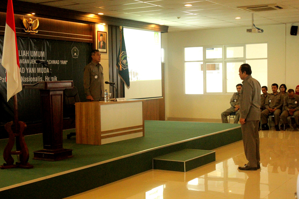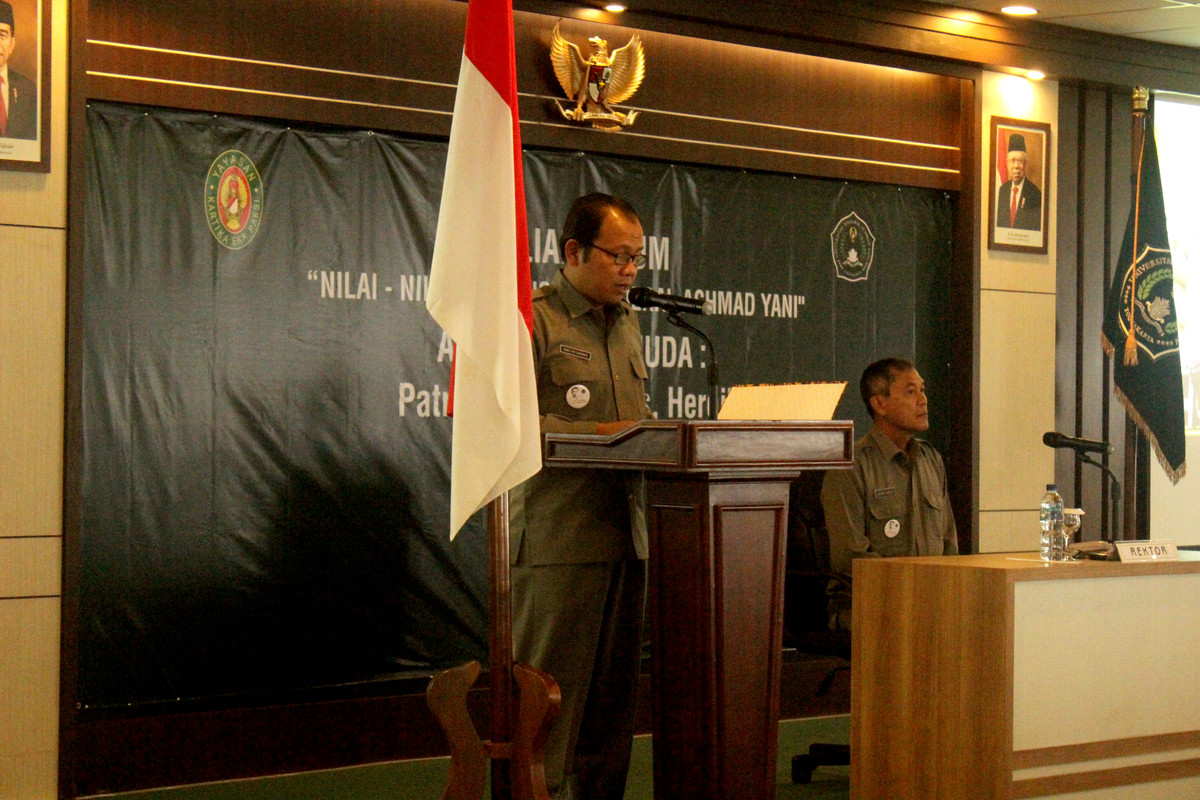SLEMAN – Bertempat di Auditorium Kampus 1 Universitas Jenderal Achmad Yani (Unjani) Yogyakarta, diselenggarakan pembukaan rangkaian agenda kegiatan Dies Natalis Kedua Unjani Yogyakarta oleh Rektor, Dr. Drs. Djoko Susilo, S.T., M.T., pada Selasa, (03/03/2020). Dalam laporannya, Dekan Fakultas Ekonomi dan Sosial selaku Ketua Panitia pelaksana Dies Natalis Kedua Unjani Yogyakarta, Edhy Tri Cahyono,S.Si., M.M., menyampaikan bahwa Dies Natalis Kedua Unjani Yogyakarta mengusung tema Achmad Yani Muda: Patriotik, Nasionalis, Heroik, dimana akan diselenggarakan berbagai kegiatan, yang dimulai dengan Kuliah Umum Nilai-nilai Kejuangan Jenderal Achmad Yani pada tanggal 03 Maret 2020, dan di akhiri dengan puncak acara yang ditandai dengan Sidang Senat Terbuka pada tanggal 26 Maret 2020 yang akan datang. “Berbagai kegiatan tersebut dapat terlaksana atas dukungan seluruh unit kerja di Unjani Yogyakarta” ujarnya. Selain itu, Edhy Tri Cahyono,S.Si., M.M., juga mengucapkan terima kasih kepada para Organisasi Kemahasiswaan yang juga ikut berpartisipasi dengan berbagai kegiatan yang mencerminkan semangat Achmad Yani Muda: Patriotik, Nasionalis, Heroik.