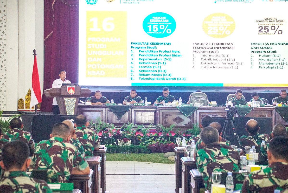 Dalam paparannya, Ketua BPH Unjaya menyampaikan bahwa Unjaya merupakan Universitas milik Yayasan Kartika Eka Paksi (YKEP), sedangkan YKEP merupakan Yayasan milik TNI Angkatan Darat. “Kasad Jenderal TNI Dudung Abdurachman, S.E., M.M., adalah Ketua Pembina YKEP dan Letjen TNI (Purn) Tatang Sulaiman, S.Sos, M.Si. adalah Ketua Pengurus YKEP. Hal tersebut memiliki makna bahwa Unjaya merupakan bagian tidak terpisahkan dari YKEP maupun TNI Angkatan Darat, sehingga perlu diketahui oleh para Komandan Satuan di lingkungan Kodam IV/Diponegoro” tegasnya. Lebih lanjut Ketua BPH Unjaya menyampaikan bahwa YKEP dan Unjaya telah berkontribusi dalam pembangunan dan pengambangan TNI AD, salah satunya dengan memberikan potongan biaya pendidikan untuk putra dan putri KBAD sebesar 15% di Fakultas Kesehatan (FKES), sebesar 25% di Fakultas Ekonomi dan Sosial (FES), dan sebesar 25% di Fakultas Teknik dan Teknologi Informasi (FTTI) sehingga diharapkan para Komandan Satuan menyebarkan Informasi tentang potongan tersebut kepada seluruh KBAD untuk dimanfaatkan, dan menyebarkan informasi tentang Unjaya kepada Maysrarakat di wilayah kerjanya.