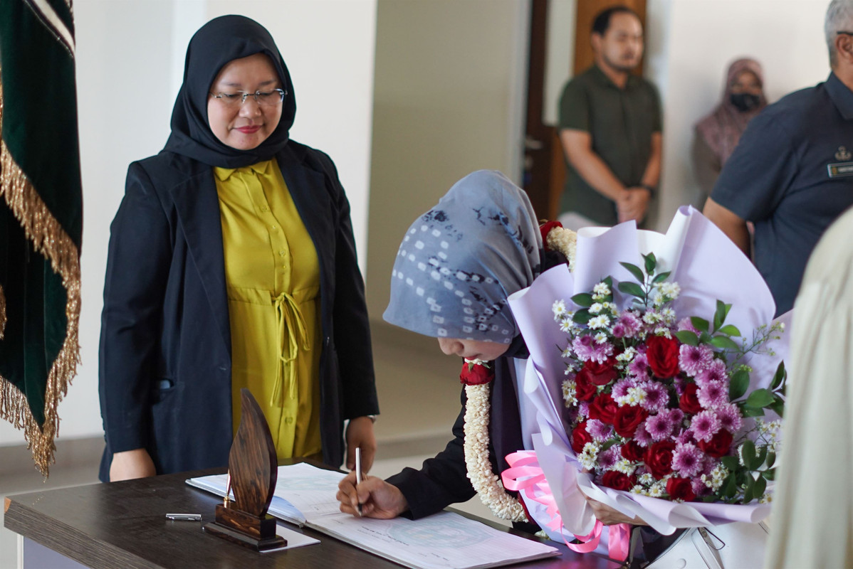 Prosesi dilanjutkan dengan pengisian buku tamu dan penyambutan Rektor Unjaya periode 2023-2027 oleh Rektor Unjaya periode 2018-2023, Dr. Drs. Djoko Susilo, S.T., M.T., IPU., yang dilanjutkan dengan ramah tamah dan penyampaian risalah jabatan. Hadir dalam kegiatan tersebut para pejabat struktural Rektorat dan Dekanat, Dosen, tenaga kependidikan, dan mahasiswa Unjaya. [kpa]