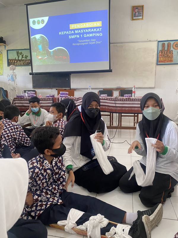 SLEMAN – Unit Kegiatan Mahasiswa (UKM) FANS KSR Unjaya mengadakan kegiatan pengabdian kepada masyarakat dengan tema “Sekolah Siaga Bencana – Tanamkan Jiwa Kesiapsiagaan Sejak Dini” kepada siswa-siswi SMPN 1 Gamping, Sleman, Yogyakarta pada Sabtu, (19/3/2022). Kegiatan diawali dengan pematerian seputar kebencanaan, penyelamatan diri dan pertolongan pertama saat terjadi bencana gempa bumi dan banjir yang dibawakan oleh Pembina dan mahasiswa Unjaya yang tergabung dalam UKM KSR PMI. Kegiatan Sekolah Siaga Bencana ini diikuti oleh kelas 7 dan 8 SMPN 1 Gamping dengan jumlah 50 siswa. SMP N 1 Gamping terletak terletak di salah satu daerah yang mendapatkan dampak dari meletusnya gunung merapi.