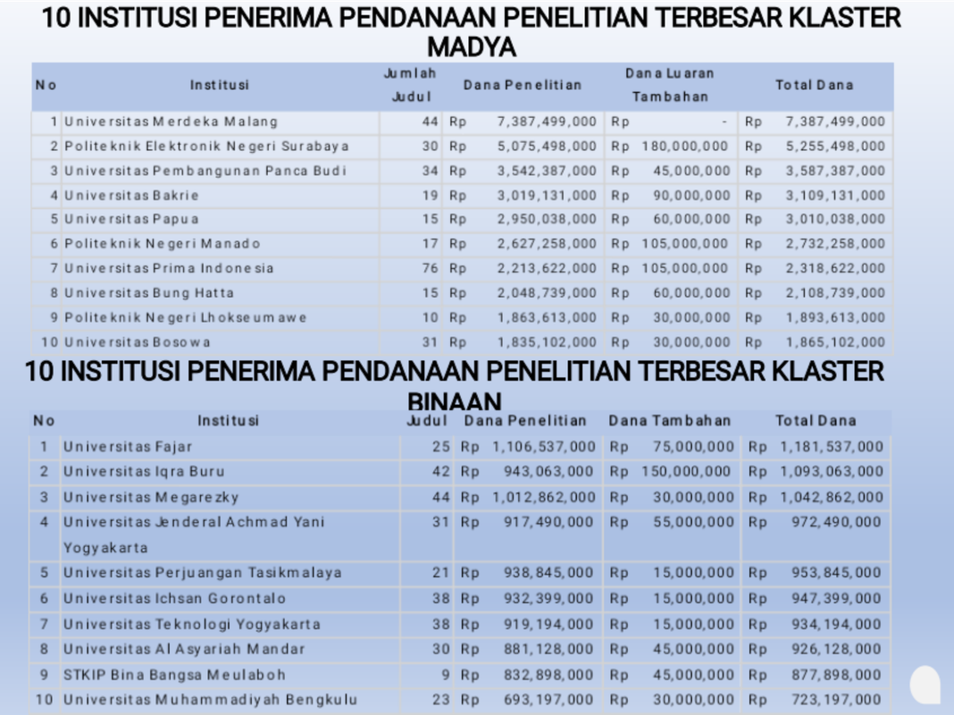 SLEMAN – Berdasarkan Pengumuman Direktur Riset dan Pengabdian Masyarakat tentang Penerima Pendanaan Penelitian dan Pengabdian kepada Masyarakat di Perguruan Tinggi Tahun Anggaran 2020 Nomor: B/87/E3/RA.00/2020 yang diterbitkan pada hari Selasa, 28 Januari 2020 pada halaman http://simlitabmas.ristekdikti.go.id/, Universitas Jenderal Achmad Yani Yogyakarta berhasil meraih 32 Judul Penelitian hibah DIKTI tahun pelaksanaan 2020. Dari 32 judul tersebut terdiri dari dua skema, yakni 1 judul untuk penelitian terapan dan 31 judul penelitian dosen pemula. Dari perolehan pendanaan penelitian tersebut menjadikan Universitas Jenderal Achmad Yani Yogyakarta menduduki peringkat ke 4 dari 10 Institusi Penerima Pendanaan Penelitian Terbesar Klaster Binaan di tahun 2020. Hal ini tentunya membuat semangat bagi para dosen untuk terus meningkatkan kuantitas dan kualitas penelitian khususnya penelitian Hibah DIKTI pada tahun-tahun berikutnya.