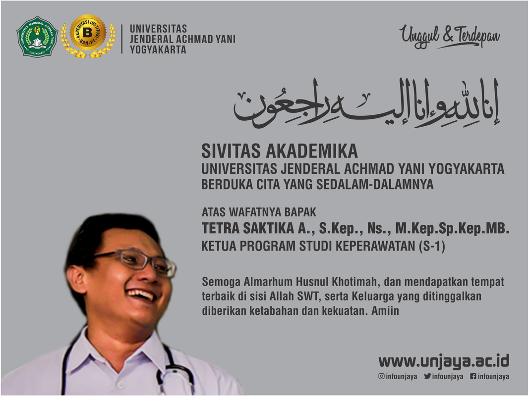 Berita berpulangnya Almarhum pada Senin malam, (25/05/2020) pukul 19.15 WIB di RS PKU Muhammadiyah Jogja karena sakit, sangat mengejutkan seluruh Sivitas Akademika, apalagi tidak pernah terdengar berita kalau Almarhum menderita sebuah penyakit. Almarhum merupakan salah satu Dosen yang bergabung sejak awal-awal berdirinya Sekolah Tinggi Ilmu Kesehatan (Stikes) Jenderal Achmad Yani Yogyakarta, yang sekarang menjadi Fakultas Kesehatan Universitas Jenderal Achmad Yani Yogyakarta. Bergabung sejak 21 Juli 2007, Almarhum menahkodani Program Studi Keperawatan (S-1) sejak tahun 2016 telah menorehkan bebagai prestasi, dimana salah satunya berhasil menghantarkan Program Studi Keperawatan (S-1) meraih Akreditasi Program Studi pada tahun 2018, dan hasil Ujian Kompetensi yang mencapai 97.2 % pada tahun 2019.