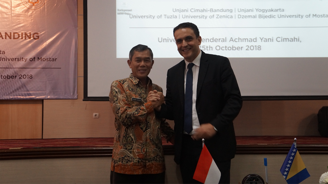 Cimahi – Rektor Unjani Yogyakarta bersama Dekan Fakultas Teknik dan Informasi Tekhnologi serta Kepala Bagian Kerjasama Unjani Yogyakarta menghadiri pertemuan penandatanganan MoU di Unjani Cimahi-Bandung dengan beberapa Perguruan Tinggi di Bosnia yang dilakukan di Kampus Unjani Cimahi pada Kamis, (25/10/2018). Penggagas acara pertemuan tersebut adalah Unjani Cimahi-Unjani Yogyakarta dan tentunya yang paling utama adalah dari Ibu Amelia Achmad Yani sebagai Kedubes RI untuk Bosnia Herzegovina.