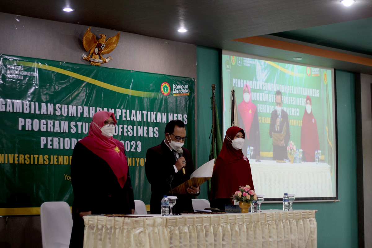 Sumpah dan pelantikan Ners periode I tahun 2023 ini dipinpin langsung oleh Ketua DPW Persatuan Perawat Nasional Indonesia (PPNI) DI Yogyakarta, Tri Prabowo, SKp., MSc., didampingi Dekan Fakultas Kesehatan Unjaya, Ida Nursanti, S.Kep., Ns., M.P.H., dan Ketua Prodi Profesi Ners Fkes Unjaya, Yanita Tri Setiyaningsih, S.Kep., Ns., M.Kep diikuti oleh 38 Ners muda Unjaya angkatan XVIII dan 1 Ners Baru dari UMY. Kegiatan ini dihadiri oleh Asosiasi Institusi Pendidikan Ners Indonesia (AIPNI) Regional VIII DIY, perwakilan Diklat dan pembimbing klinik/perseptor dari berbagai lahan praktik yang digunakan Prodi Profesi Ners Unjaya.