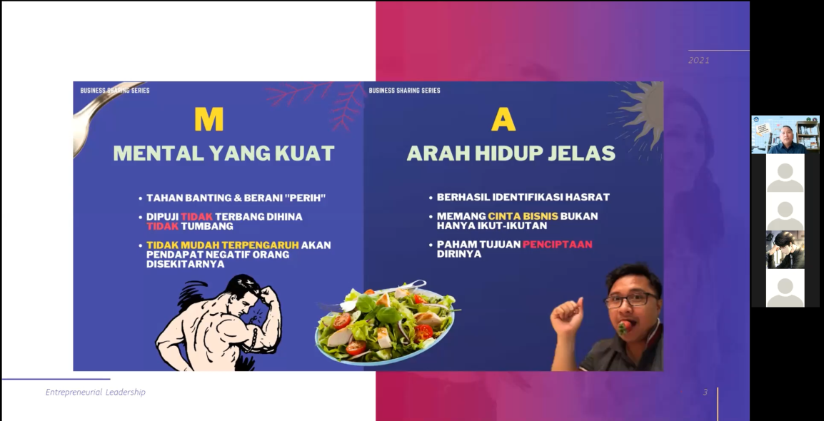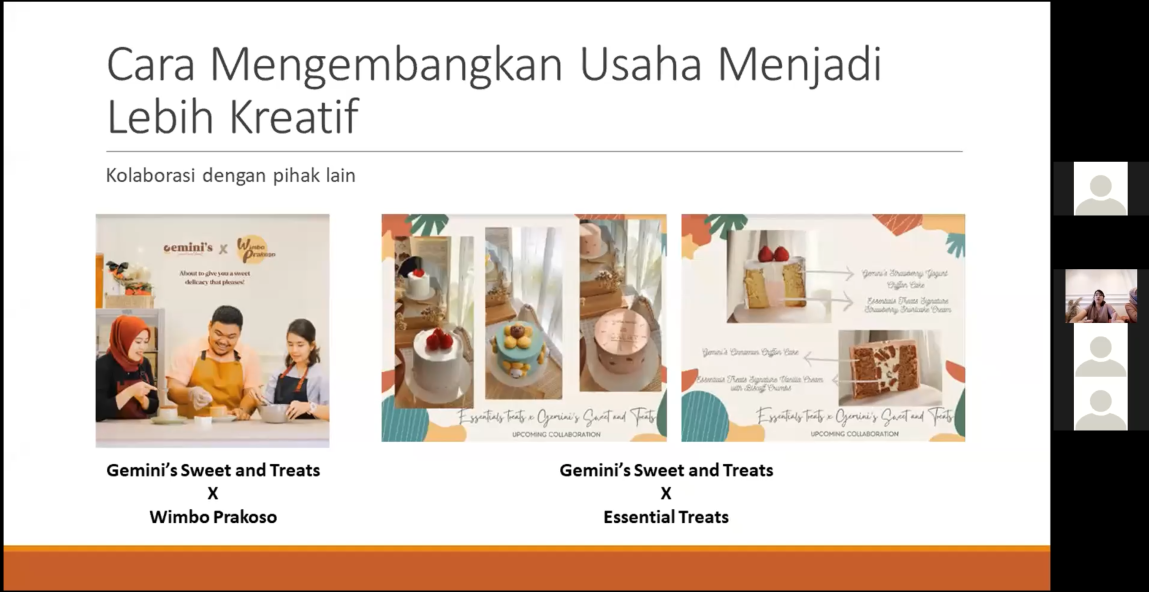 Ilmu kewirausahaan bisa kita dapatkan dari seorang yang berpengalaman dalam bidangnya atau dari buku-buku. Untuk Webinar kali ini kita mengundang dua narasumber yang hebat dalam bidang kewirausahaan. Narasumber pertama yaitu Bapak Bagus Aditya, MBA. Beliau merupakan seorang wirausahawan yang memiliki usaha dibidang makanan. Pak bagus memiliki usaha yaitu PT I’m Food dan juga selaku Konsultan bidang usaha di Aufson Consulting. Profil Pak Bagus memberikan gambaran bahwa beliau seorang pembisnis yang hebat. Narasumber kedua yaitu Ibu Sadya Putri Anggarini, S.Si. Beliau merupakan Owner Gemini’s Sweet and Treats. Bu Sadya bukan berasal dari bidang wirausaha tetapi beliau merupakan lulusan matematika UGM. Beliau mendirikan toko rotinya bersama rekannya yang berawal dari hobi kemudian coba-coba hingga sekarang namanya sudah dikenal oleh banyak orang.
